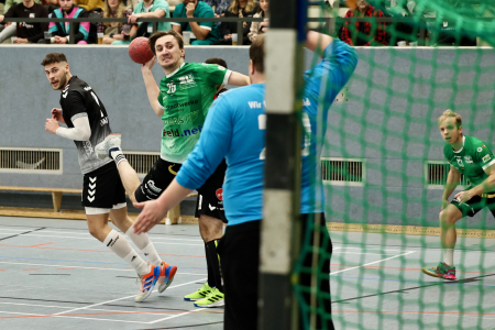 Suchende: Die Remscheider mit Torhüter Max Conzen und Rückraumspieler Kaan Taymaz (links) wollen als Tabellenführer eher die Angriffe der Konkurrenz abwehren, die Langenfelder mit Torben Richartz (beim Wurf) und Julian Schulz (rechts) vor allem den Weg aus dem Tabellenkeller finden. (Foto: Thomas Ellmann)