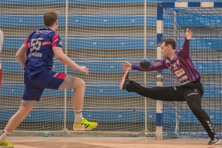 Wiedersehen: Longerichs Torhüter Lennart Kull, der vor einem Jahr aus Dormagen zum LSC kam will liebend gerne zu viele Gegentreffer verhindern – und Frederik Sondermann mit dem TSV Bayer so oft wie möglich erfolgreich sein. Im Testspiel vor Kurzem war Sondermann mit sechs Toren der beste Werfer des Abends. (Foto: Thomas Schmidt)