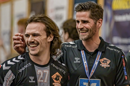Alles in Butter: Joe Ballmann (links), der mit bisher 110 Treffern aus 18 Spielen erfolgreichste Torschütze der Mannschaft, und Panther-Trainer Alexander Oelze scheinen mit der Lage allgemein zufrieden zu sein. Die Karten im Kampf um den Klassenerhalt sind ja auch nicht so schlecht. (Foto: Thomas Schmidt)